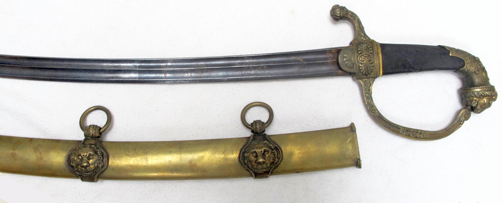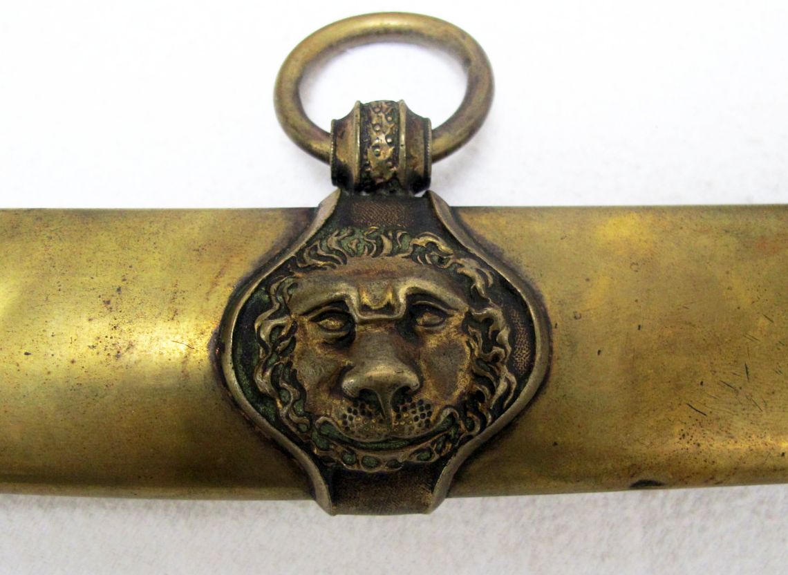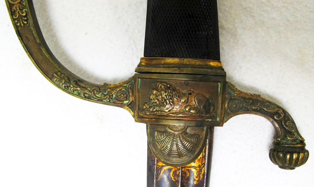 Vergleichbar mit den typischen, französischen Generalssäbeln, im Gegensatz zu diesen jedoch mit einem liegenden Löwen auf dem terzseitigen Parierlappen, wie man diesen nahezu identisch bei bayrischen Beamtendegen aus jener Zeit findet. Klinge mit Schörn und Pandurenspitze sowie beidseitig zwei Hohlkehlen, gebläut und vergoldet. Zugehörige Messingscheide mit Ringbändern in Form von Löwenköpfen.