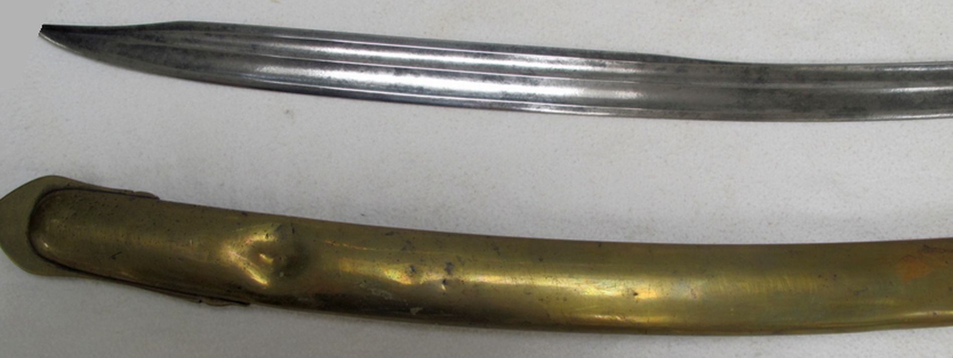 Unberührter, originaler und ungereinigter Zustand, das Gefäß etwas locker und die Klinge ist auf der Innenseite gedunkelt, sonst sehr gut. Gesamtlänge ohne Scheide 102 cm, Klingenlänge 86,5 cm, Klingenbreite 3,0 cm.
