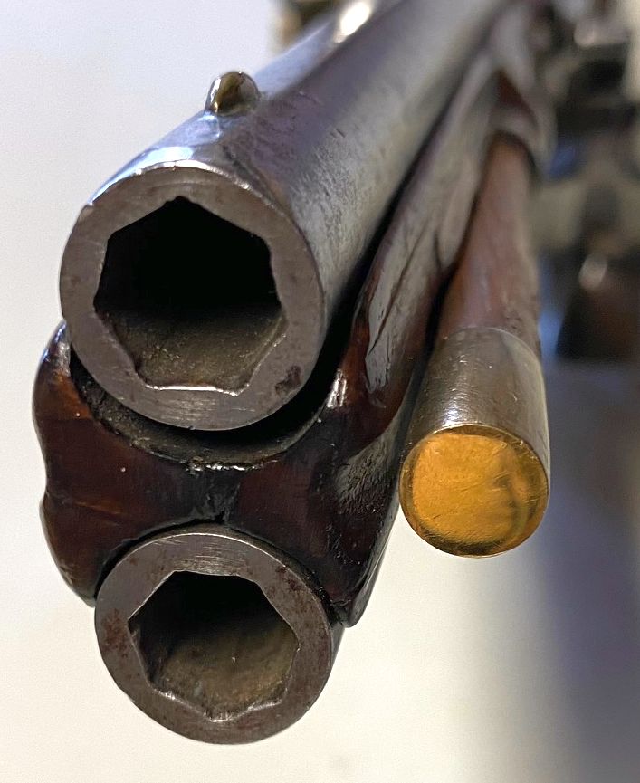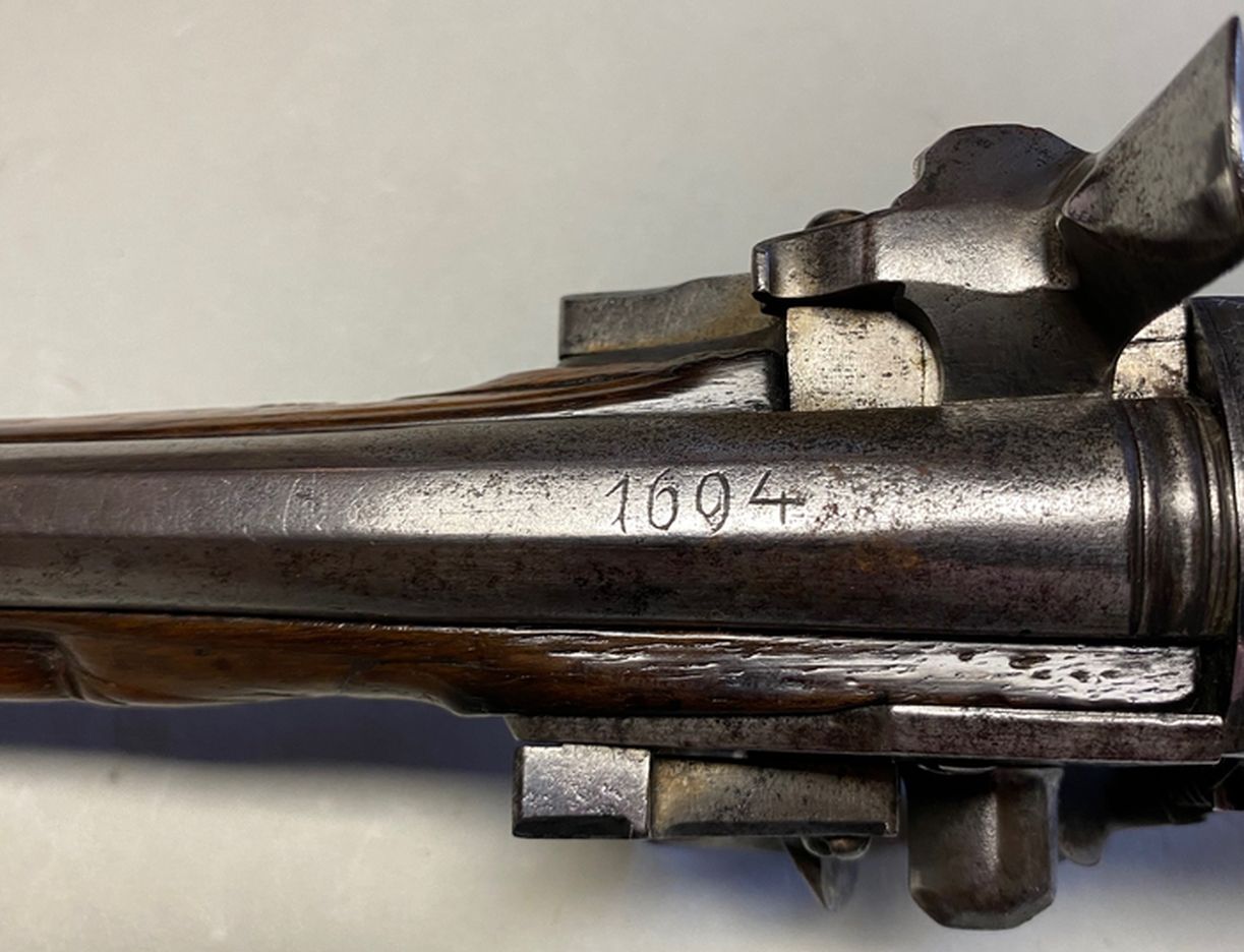 Wunderschöner, geflammter Kolben mit geschnitztem Maskeron am Kolbenende, entsprechender Vorderschaft mit Ladestockkanal an einer Seite, das Spitzröhrchen aus dem Schaftholz herausgearbeitet. Typisch niederländisches Schloss mit flachem Schlossblech und feiner Blattgravur. Der ebenfalls flache Hahn mit charakteristisch niederländischer Form. Freistehende, eiserne Pfannen ohne Verbindung zum Batterielager und Batterieschlagflächen oben gerade abgeschnitten. Übereinander angeordnete, siebenfach gezogene Läufe mit Jahreszahl „1694“ an beiden Oberseiten über den Pulverkammern. Auslösung der Wendemechanik durch Zurückziehen eines vor dem Abzugsbügel positionierten Hebels. Originale, hölzerner Ladestock mit Bronzehülse an der Stoßseite. Gesamtlänge 340 mm, Lauflängen 185 mm, Schlosslänge 145 mm, Kaliber der gezogenen Läufe 8,1 mm, Gewicht 1.008 g
