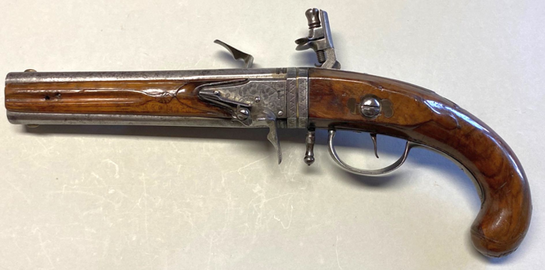 Bei dieser Waffe dürfte es sich um ein Exemplar handeln, welches ursprünglich in Frankreich zu Beginn des 17. Jahrhunderts entstanden ist. Um 1750 hat man die Pistole modernisiert, d.h. sie wurde gekürzt, neu geschäftet und sie erhielt zwei gezogene Läufe.