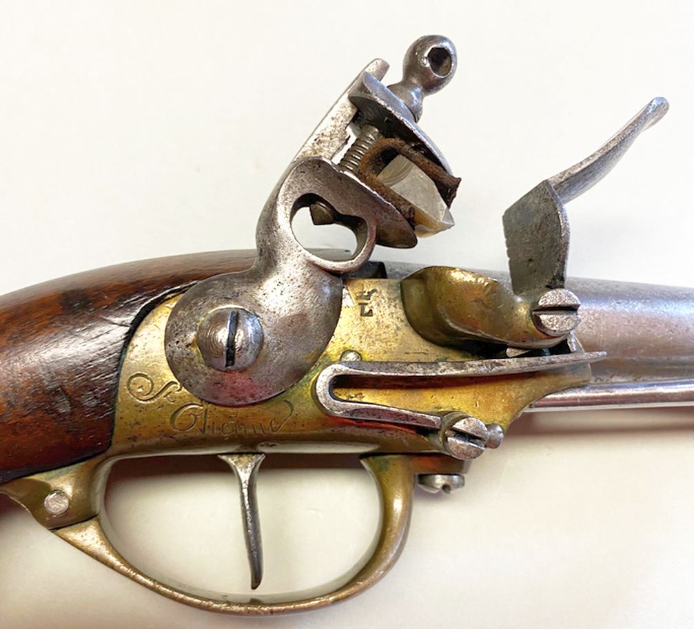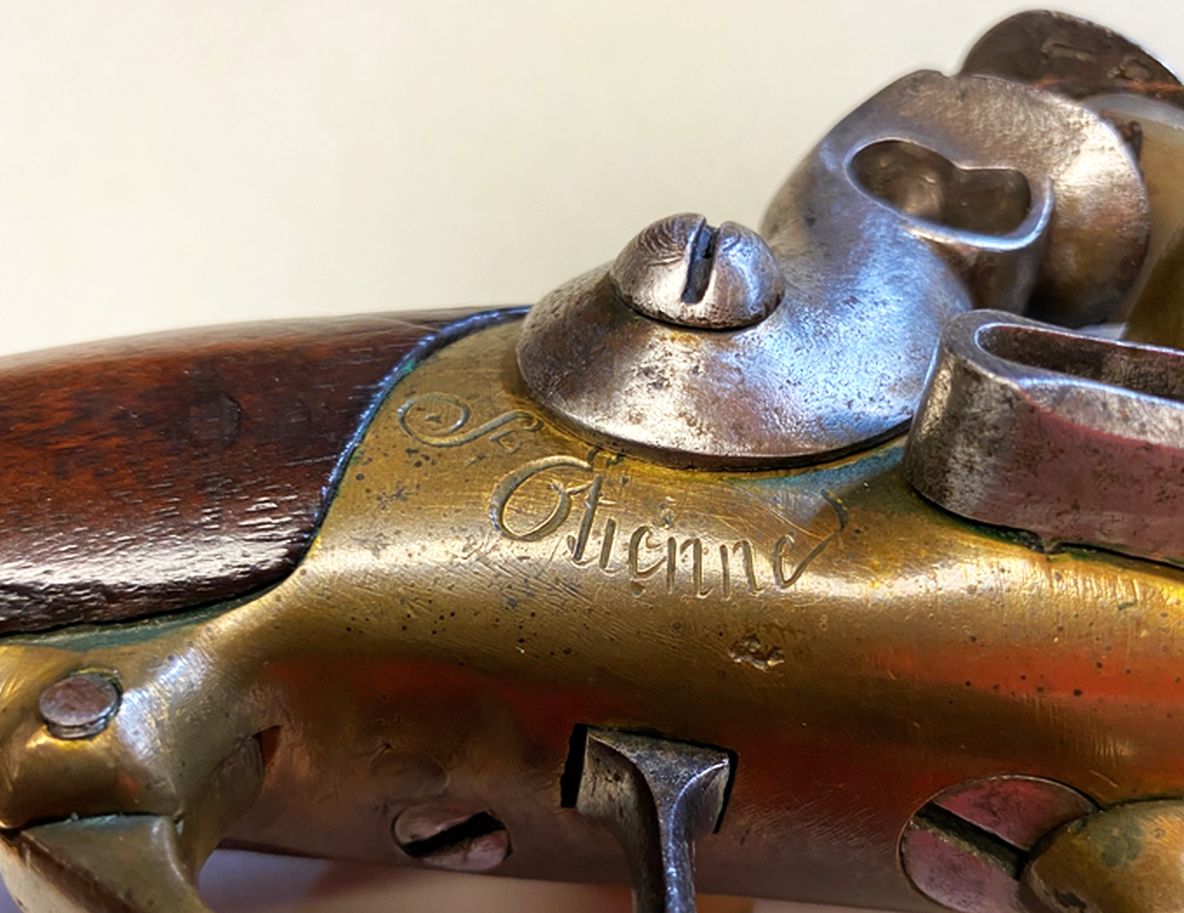 Nussbaum-Halbschaft mit Kolbenkappe und Abzugsbügel aus Messing Runder, am Pulversack kantiger Lauf. Lauf/Schaft-Verbindung durch Schraube im Schwanzschraubenblatt und von der Schlosskastenunterseite eingesetzte Metallgewindeschraube. Schwanzschraubenblatt gerade auslaufend. Direkt an der Nahtstelle zum Schwanzschraubenblatt ansetzender oberer Kolbenbügel, der bis unter die Nase der Kolbenkappe reicht. Aus Gussmessing gefertigter Schlosskasten mit Namensgravur „M. PICON“ des Gelbgießers an der Innenseite unten. Kontrollmarke „L“ unter Krone vermutlich des 1. Kontrolleurs Etienne Lambert, in St. Etienne tätig von 177 bis 1784 auf dem Schloßblech außen, Herstellersignatur „St.Etienne darunter. Jahreszahl der Laufabnahme „80“ und darüber Stempel „B“ unter Krone (Kontrolleur Joseph Bertheas 1772-1785) am Lauf oben links. Eiserner, ergänzter Ladestock mit trapezförmigem Kopf.