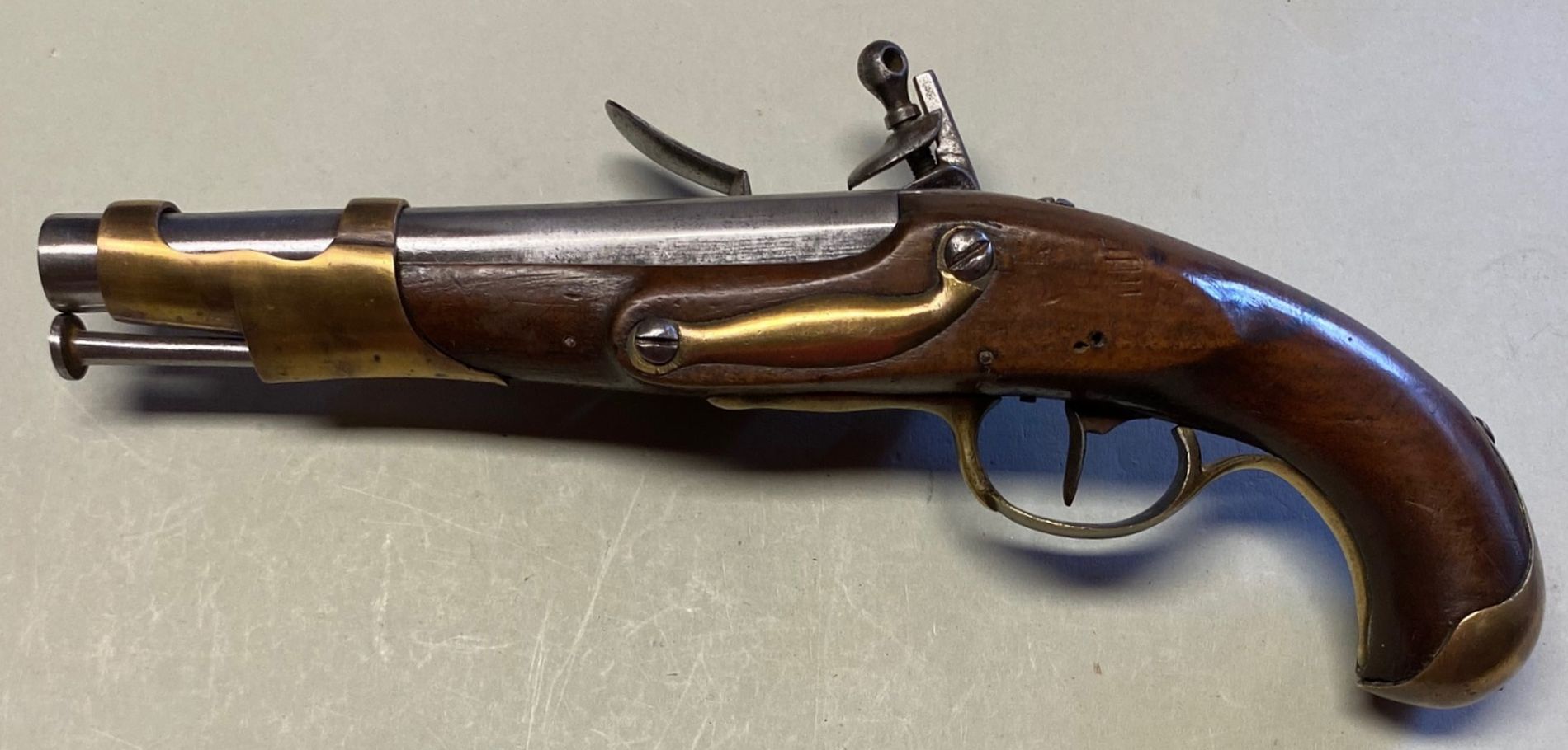 Nussbaum-Vollschaft mit kupferhaltigen Messingbeschlägen, bestehend aus doppelbündigem Laufring mit rechtsseitiger Federarretierung und Ladestocktrichter, einteiligem Abzugsbügel mit zweifacher Stiftbefestigung, gewölbtem Schlossgegenblech für zwei Schrauben und Kolbenkappe mit zwei Befestigungsschrauben. Steinschloss M an 9 mit links vom Hahn gewölbter Schlossplatine, entsprechendem Herzhahn und gegossener Messingpfanne. Herstellersignatur „St.Etienne“ auf der Schlossplatine unterhalb der Pfanne, darüber Stempel „S“ im Hochoval, welcher vermutlich Claude Soviche zuzuschreiben ist. Soviche war während des Jahres IV in der Manufacture National de St. Etienne Kontrolleur für die Schlossplatinen. Runder Lauf mit seitlichen Flachschliffen am Pulversack. Staatliche Abnahme „RF“ für République Francaise am Lauf rechts in Höhe der Batterie und Stempel „Anker unter phrygischer Mütze“ an der Laufoberseite. Eiserner, ergänzter Ladestock mit nagelförmigem Stoßkopf. Gesamtlänge 312 mm, Lauflänge n175 mm, Kaliber des glatten Laufs 17,0 mm, Schlosslänge 118 mm, Gewicht 951 g,