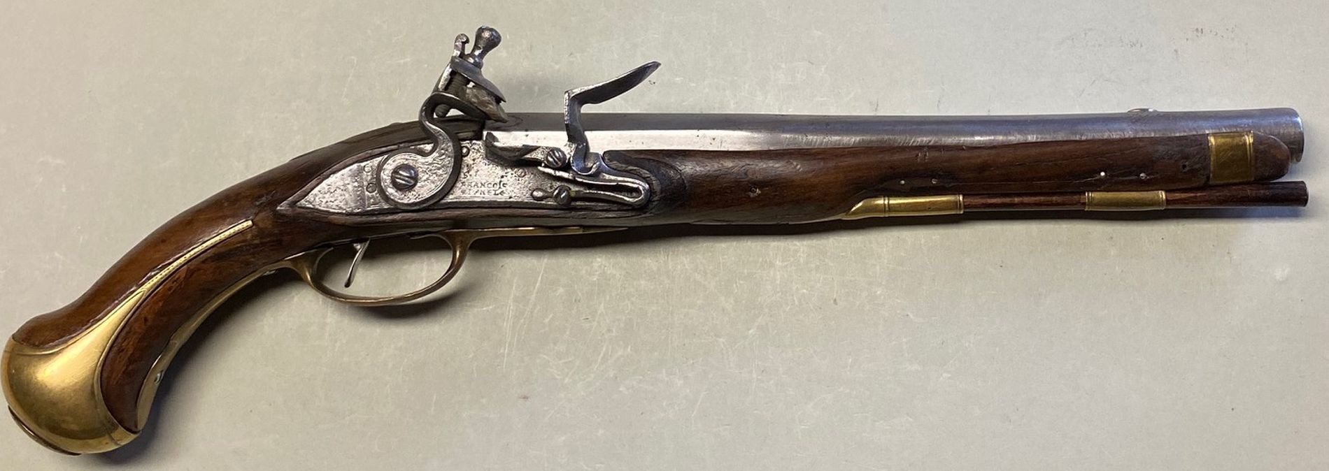 Gut erhaltener Nussbaumvollschaft mit ovalen Verschneidungen um das Schloss, das Schlossgegenblech und das Schwanzschraubenblatt. Messingbeschläge, bestehend aus halbem Vorderschaftband, zwei Ladestockröhrchen, Abzugsbügel mit charakteristischem vorderem Abschluss in Lilienform, Kolbenkappe mit langen, seitlichen Sporen und flächigem, für den Waffentyp ebenfalls charakteristischem Schlossgegenblech für zwei Schrauben. Alle Beschlagzeile mit feiner Randstichgravur, das Schossgegenblech mit floralem Dekor. Runder, am Pulversack kantiger Lauf mit rund endendem Schwanzschraubenblatt. An der Laufoberseite ein zur Mündung hin schmaler werdender und bis zum Korn reichender Flachschliff, dieser mit Signatur „REG. ROYAL DES CRAVATES“. Lauf/Schaftverbindung durch Kreuzschraube und zwei Stifte/Ösen. Steinschloss M 1733 mit flachem. an den Kanten abgeschrägtem Schlossblech und ebensolchem Schwanenhalshahn. Auf dem Schlossblech unterhalb der eisernen Pfanne die Herstellersignatur „FRANCOIS PENEL“. Hölzerner, originaler Ladestock mit konisch erweitertem Setzkopf mit Eisenplättchen. Die Pistole befindet sich in gutem, originalem Zustand und ewinwandfreier MechanikGesamtlänge 489 mm, Lauflänge 3090 mm, Kaliber des glatten Laufs 18,28 mm