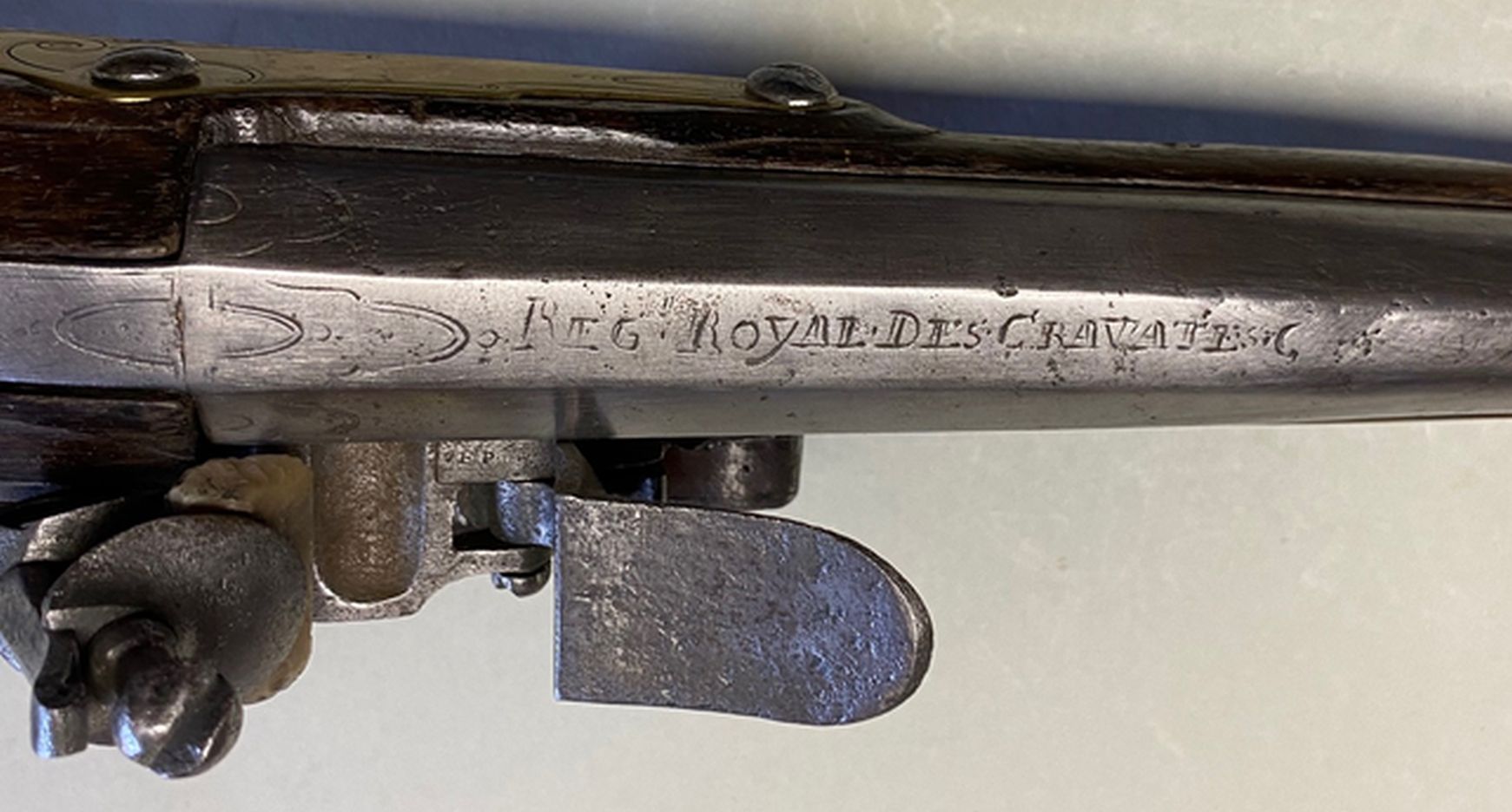 Dies ist eine von Francois Penel für das königliche Regiment Kroaten gefertigte Pistole. Ihre sorgfältige Ausführung mit den zusätzlichen Dekorationen spricht dafür, dass sie auf die private Bestellung eines im Königlichen Regiment Kroaten dienenden Offiziers zurückgeht. Dieses Regiment war 1643 aus kroatischen Reitersöldnern aufgestellt worden und wurdfe 1667 in die Linienkavallerie übernommen. Im Jahr 1761 hat man das „Régiment de Chabrillan Cavalerie“ in das Kroaten-Regiment eingegliedert, wodurch die Stärke von zwei auf vier Eskadrons anstieg. Jede Eskadron bestand nun aus 4 Kompanien zu je 40 Reitern, zusammen 649 Reiter. Interessant in diesem Zusammenhang ist, dass die länglichen Halstücher aus der kroatisch geprägten Gründungsphase des Regiments als Vorläufer der Krawatte gelten, deren Name auch davon hergeleitet wird.Die Pistole entspricht weitgehend der mit Ordonnanzbefehl vom 28. Mai 1733 eingeführten und mit einem Reglement vom 18. Januar 1734 dimensionsmäßig festgelegten Kavalleriepistole, welcher über 25 Jahre bei der Truppe verwendet und erst nach dem Siebenjährigen Krieg von einem Nachfolgemuster ersetzt wurde. Der Umstand, dass die Pistole ovale Verschneidungen am Schaft zeigt, deutet darauf hin, dass es sich hierbei um ein früheres Fertigungsmuster aus der Zeit um 1745 handelt. Später gefertigte Pistolen haben keine Verschneidungen mehr. Francois Penel aus St. Etienne war vermutlich Teilhaber der Firma Penel Frères und dort nachweisbar für die Jahre von 1746 bis 1778. Er war im Stadtrat von St. Etienne Vertreter der dort ansässigen Büchsenmacher und arbeitete 1746 sowohl für die Gendarmerie, als auch für die Kompanie Mestre de Camp im Regiment de la Mothe.