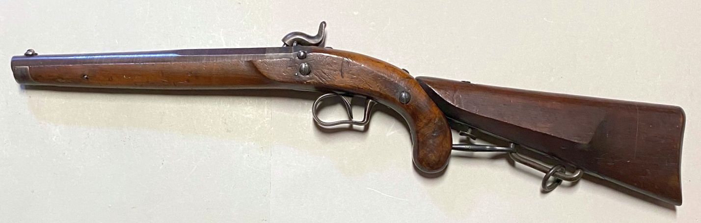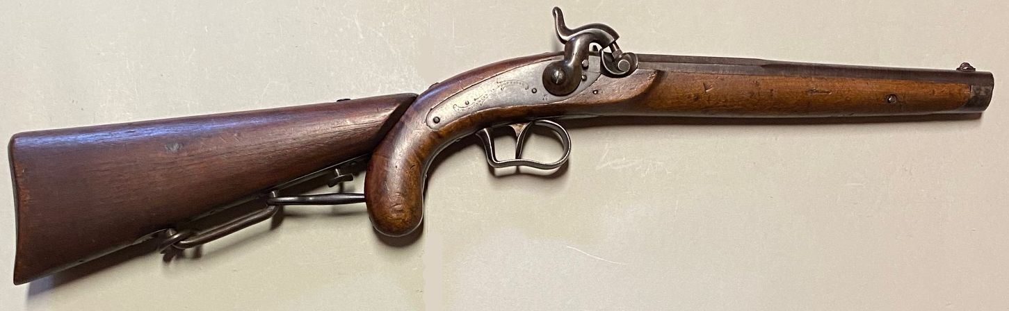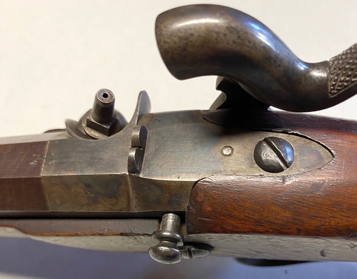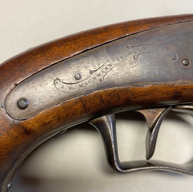 Nussbaum-Vollschaft mit Eisenbeschlägen, bestehend aus von unten verschraubtem Laufring, Unterbügel, Abzugsbügel mit Fingermulde, Kupplungsplatte für den Ansteckkolben und Unterlagen aus Messinge für zwei Schlossschrauben. Rückliegendes, bündig im Schaft eingepasstes Perkussionsschloss mit Herstellersignatur „I.H. WICHMANN IN OLDENBURG“ in Banderole. In der hinteren Hälfte kantiger, dann runder Damastlauf mit Basküle und Patentschwanzschraube mit Thouvenin’schem Dorn. In der Basküle mit Standvisier ein seitlich verschiebbarer Sicherungsbolzen, welcher nach rechts geschoben, den Hahnweg blockiert. Seriennummer „41“ auf Lauf, Schloss, Patentschwanzschraube, Schrauben und Beschlägen, Länge ohne Kolben 450 mm, Lauflänge 260 mm, Schlosslänge 120 mm, Kaliber des gezogenen Laufs 14,3 mm, 4 Züge, Gewicht mit Kolben 2.144 g