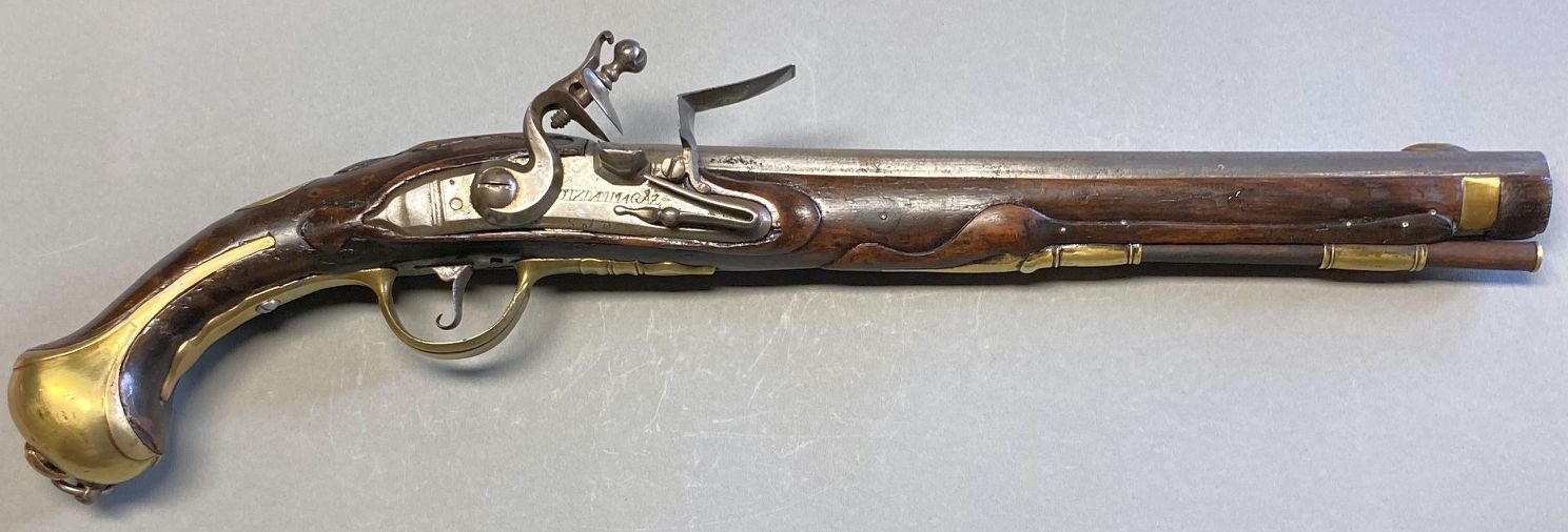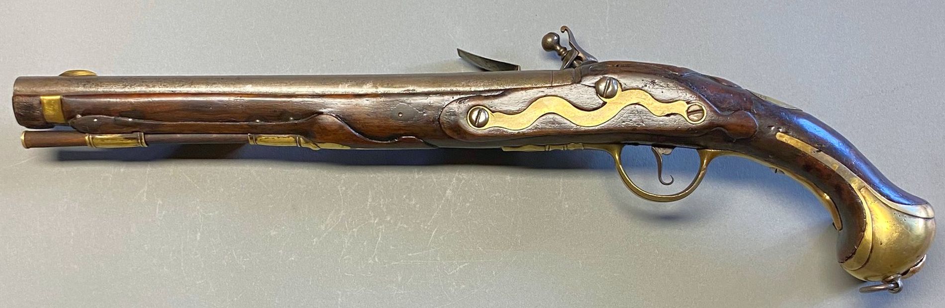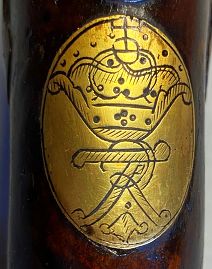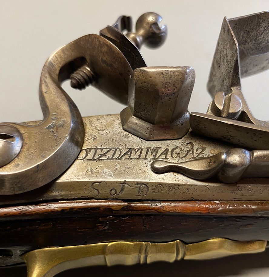gefertigt in der Gewehrfabrik Potsdam-Spandau unter der Leitung von Splitgerber & Daum, entsprechende Signatur "POTZDAM MAGAZ SetD" auf dem Schlossblech außen, bzw. an dessen unterer Schrägkante. Nussbaum-Vollschaft mit ovalen Verschneidungen um Schwanzschraubenblatt, Schlange und Schloss. Messingbeschläge, diese bestehend aus halbem Mündungsband, zwei glatten, runden, an den Enden kanellierten Ladestockröhrchen, Abzugsbügel, Kolbenkappe mit langen, seitlichen Sporen mit Kolbenring und schlangenförmigem Schlossgegenblech für drei Schrauben, welches flach und bündig in den Schaft eingelegt ist. Messingdaumenblech auf dem Kolben mit Monogramm "FR" unter Krone. Abzugsblech und stark nach hinten eingerollter Abzug aus Eisen. Preußisches Steinschloss mit flachem, an den Kanten abgeschrägtem Schlossblech und ebensolchem Schwanenhalshahn. Batterie mit nach oben eingerolltem Fuß und oben gerade abgeschnittener Schlagfläche. Die Batteriefeder von der Schlossblechinnenseite her verschraubt. Runder, am Pulversack zweimal kanellierter Lauf mit in das Schwanzschraubenblatt eingefeilter Kimme und langem Messingkorn auf dem Lauf, 52mm hinter der Mündung. Der hölzerne Ladestock mit Messingplättchen am Kopf ist ergänzt. Rest einer stilisierten Adlermarke an der Laufoberseite.Gesamtlänge 535mm, Lauflänge 335mm, Schlosslänge 141mm, Kaliber des glatten Laufs 17,9mm.