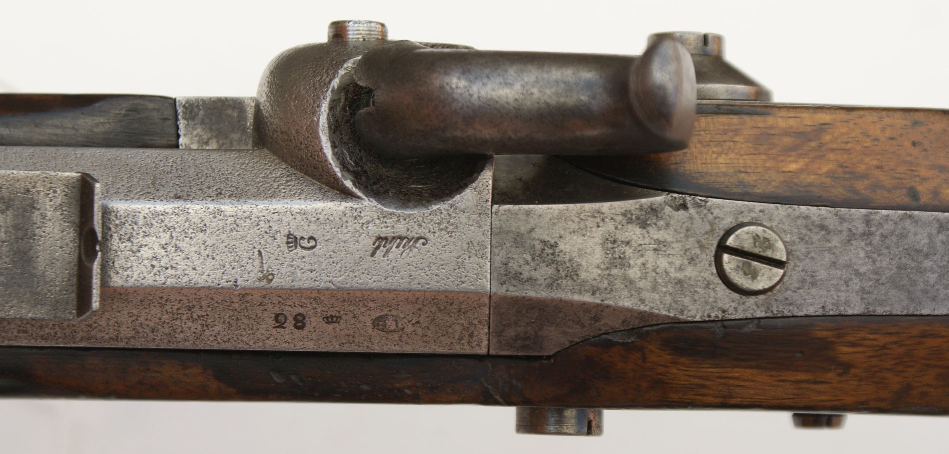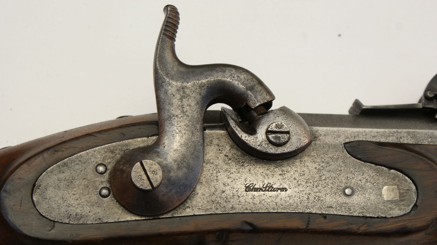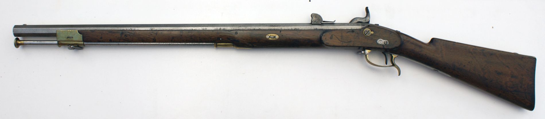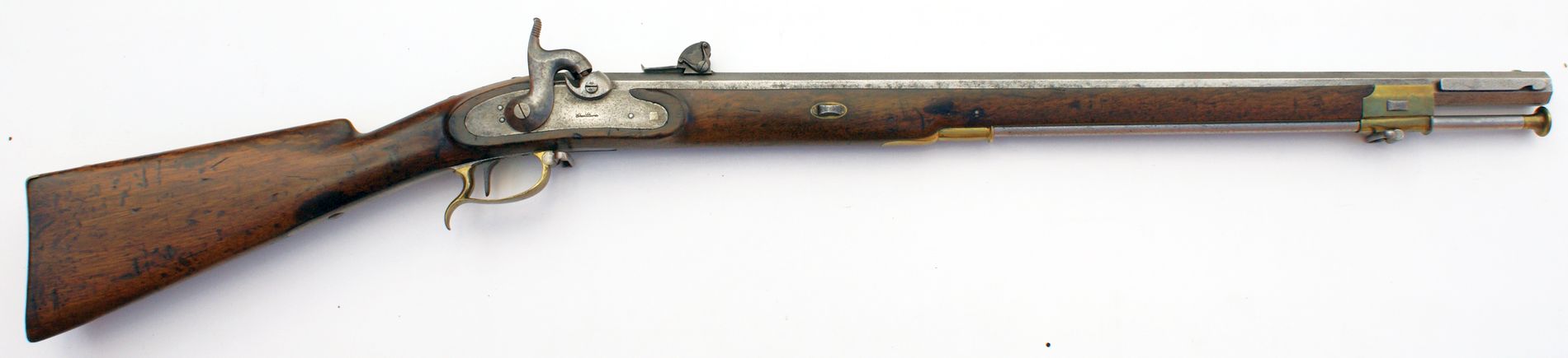 Nussbaumvollschaft mit Messingbeschlägen, diese bestehend aus halber Vorderschaftkappe mit Durchgang für den Ladestock und mit Riemenöse, Ladestockröhrchen, geschweiftem Abzugsbügel, Kolbenkappe und Unterlegplättchen für die einzelne Schloßschraube. Vorliegendes Perkussionsschloss mit Kettenglied zwischen Schlagfeder und Nuss zur Verringerung der Reibungskräfte; Nuss mit Springkeil in der Ruhrast, der beim Vorschlagen des Hahns aus der Spannrast ein Hängenbleiben desselben in der Ruhrast verhindert. Schlossplatte bunt gehärtet und makellos, Herstellersignatur „ Chn.Sturm“ auf der Schlossplatte außen. Schloss mit nur einer Halteschraube; ein Haken am Vorderende des Schlossblechs mit entsprechendem Gegenlager im Schaft bildet den zweiten Befestigungspunkt. Quadrantenvisier mit Einteilung von 300-2400 Schritt und Eisenkorn auf dem Lauf. Achtkantlauf mit 5 Minié-Zügen und Hakenschwanzschraube, die es ermöglicht, den Lauf nach Herausnehmen der beiden Schieber herauszunehmen, ohne die Kreuzschraube zu lösen. Pistonsockel mit Reinigungsschraube, in den Lauf integriert. Auf dem Lauf Herstelleradresse „SuhlF“, links daneben Fertigungsnummer „28.“ und badische Abnahme-und Endkontrollmarke „ZD“ mit Landeswappen im Oval (Zeughaus-Direktion Karlsruhe). Rechts an der Mündung Schiene zur Aufpflanzung eines Hirschfängers. Abzug mit Stifteinrichtung und einfach verschraubtem Unterlegplättchen. Eiserner Ladestock mit Messingkopf und Messingdistanzhalter. 85 mm lange Hirschfängerschiene an der rechten LaufseiteGesamtlänge 1150mm, Lauflänge 752mm, Kaliber des gezogenen Laufs 17,5mm, 14 Züge, Schlossplattenlänge 146mm.