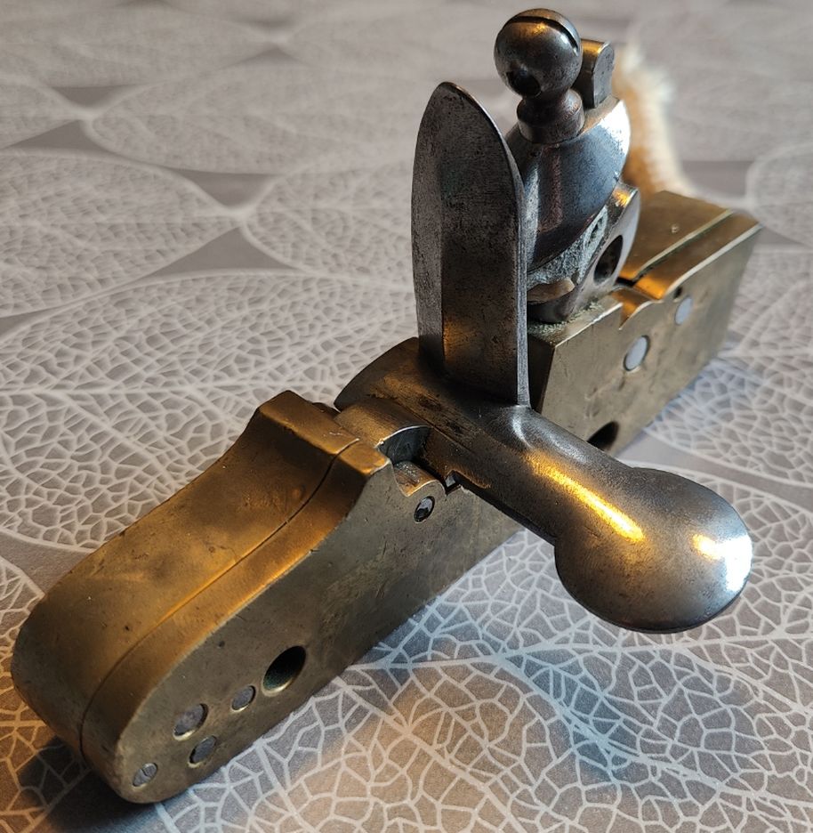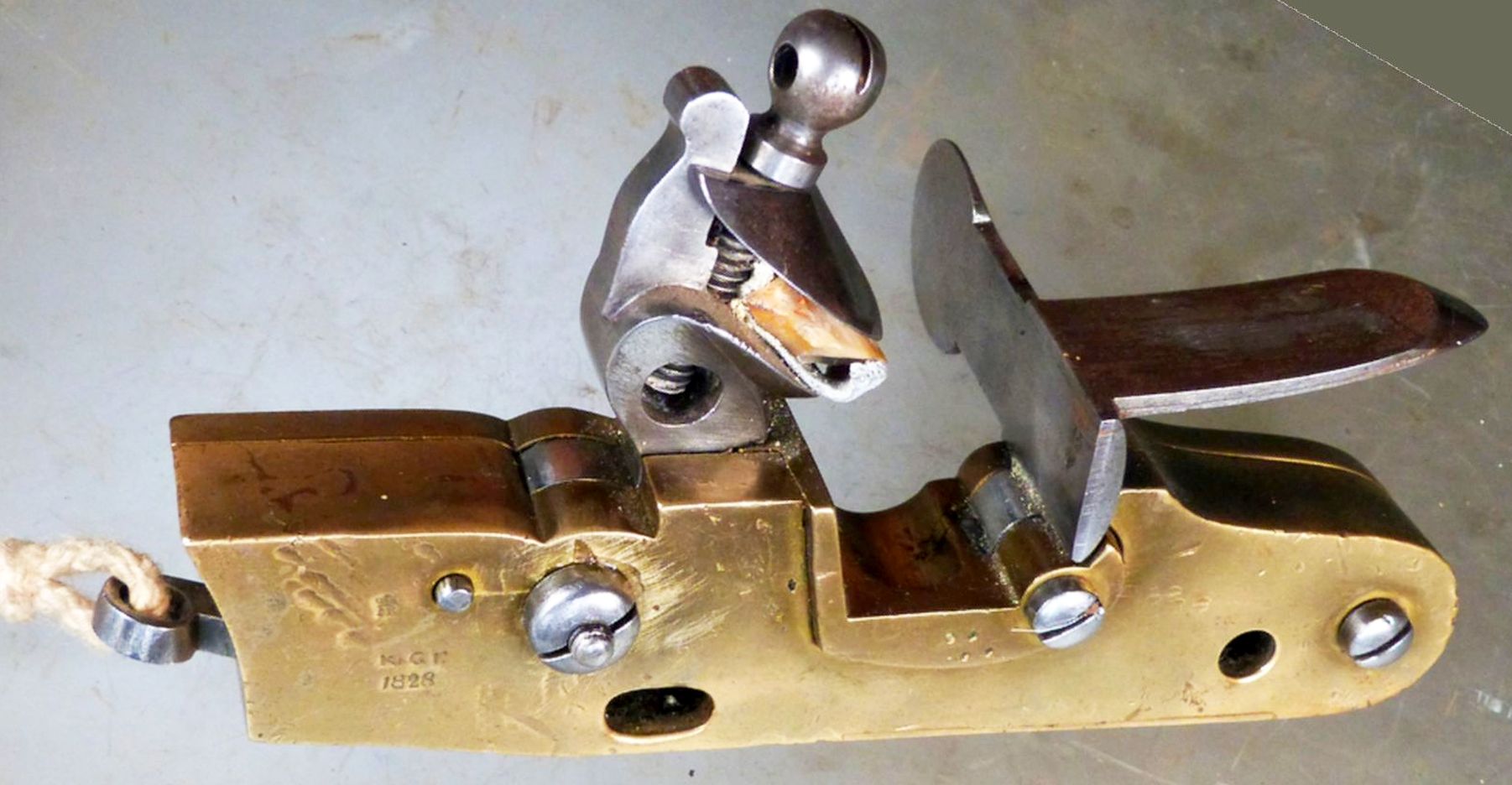 Zweiteiliger Messingkorpus mit innenliegendem Schlossmechanismus aus Stahl und integrierter Messingpfanne. Steinschlosshahn mit rundem Durchbruch und stählerne Batterie mit Handgriff zum Öffnen und oben nach vorne abgekröpfter Schlagfläche. Modelljahr 1828 am Korpus rechts, darüber nicht aufgelöster Stempel "K.G.E.". An der Korpusrückseite stählerne Abzugsöse an Abzugsstange mit geflochtenem Seilstück.